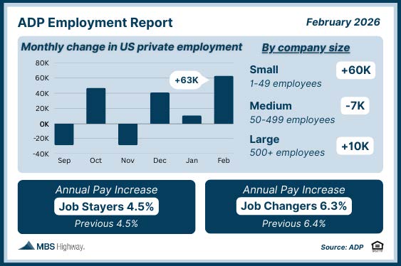 While the government’s jobs report showed losses, separate data from ADP noted that private employers added 63,000 jobs in February, topping expectations of 50,000. Small businesses drove nearly all the gains (+60,000), while medium-sized firms cut 7,000 jobs and large companies added 10,000.