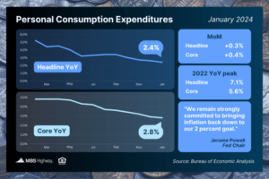 January’s Personal Consumption Expenditures (PCE) showed that headline inflation rose 0.3% for the month, with the year-over-year reading falling from 2.6% to 2.4%. Core PCE, the Fed’s preferred method which strips out volatile food and energy prices, rose by 0.4% monthly. The year-over-year reading fell from 2.9% to 2.8%, pushing this important metric one step closer to the Fed’s 2% target and its lowest level in almost three years!