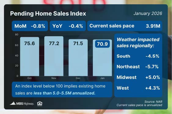 Pending Home Sales, which track signed contracts on existing homes, dipped 0.8% from December to January and were 0.4% lower than a year ago. Winter storms likely slowed activity in the South and Northeast, while the West and Midwest saw gains.