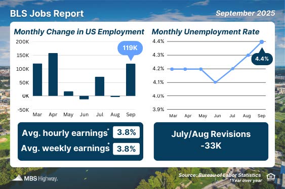 September job growth came in stronger than expected, with 119,000 jobs added versus the 50,000 forecast. However, revisions to July and August reduced the previous totals, leaving August with a net decline of 4,000 jobs. This follows a 13,000-job loss in June, marking the first two monthly declines since December 2020. The unemployment rate inched up from 4.3% to 4.4%.